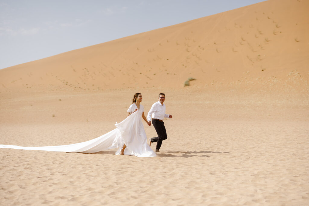 And on the very day we had planned, the desert gifted us something rare: a cooler breeze, fewer crowds, and the perfect atmosphere for the most beautiful emotions between Clarissa and Roger. Surrounded by dry trees and the world’s tallest dunes, it all came together flawlessly.