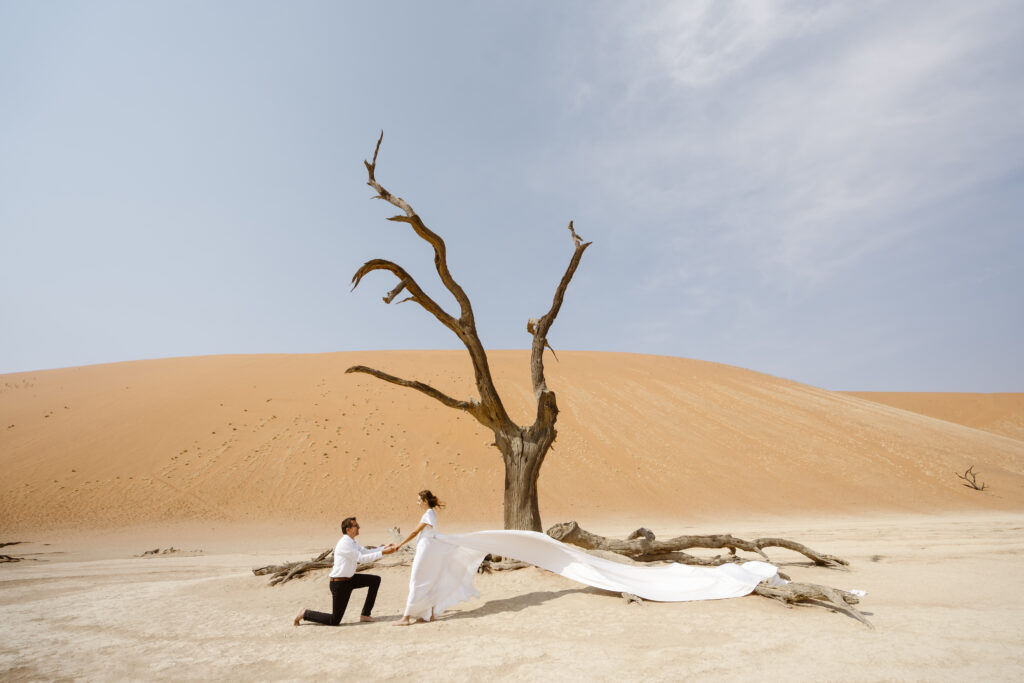 A few months ago, our friends started planning a trip to Namibia, and we decided to join. Together with Clarissa, we began secretly planning something very special in Sossusvlei. It was meant to be their photoshoot—but Roger had no idea Clarissa was preparing to tell him something important. And of course, there was supposed to be a stunning white flying dress…