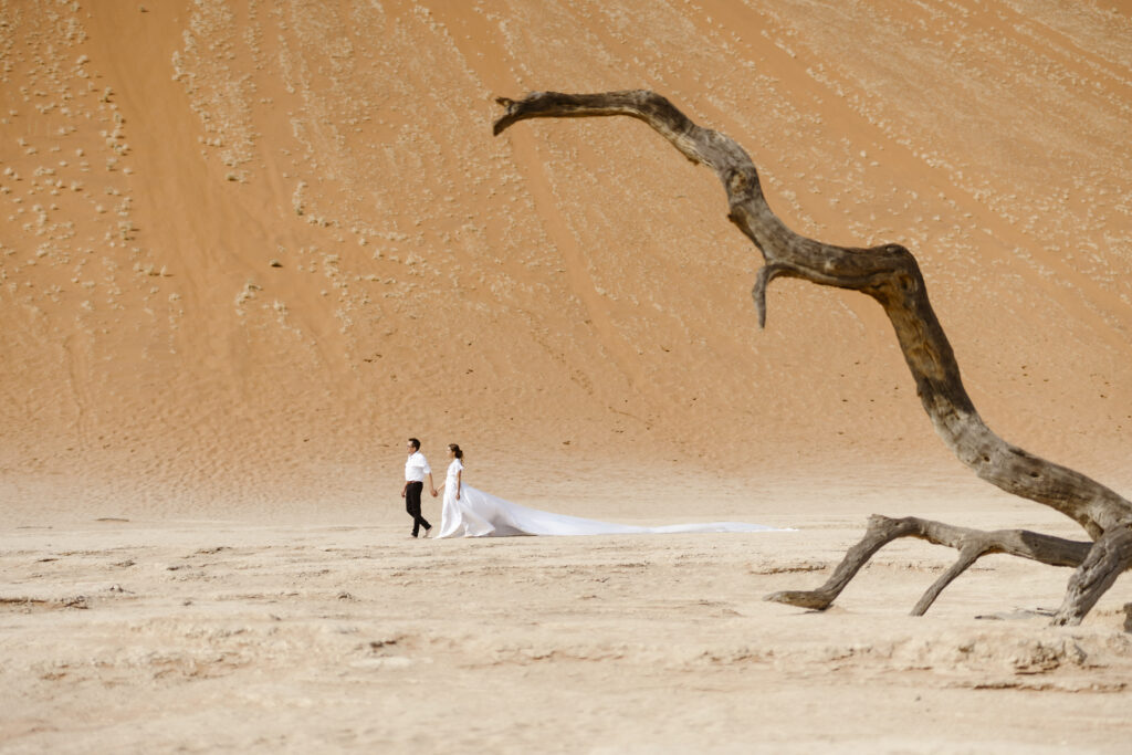 For a long time, I dreamed of photographing a couple on the world’s oldest desert – the Namib. The Namib Desert is one of the world’s oldest deserts, stretching along Namibia’s Atlantic coast. Known for its towering red sand dunes, vast gravel plains, and the surreal clay pan of Deadvlei — where ancient, sun-blackened trees stand against bright white salt flats — it offers breathtaking landscapes.